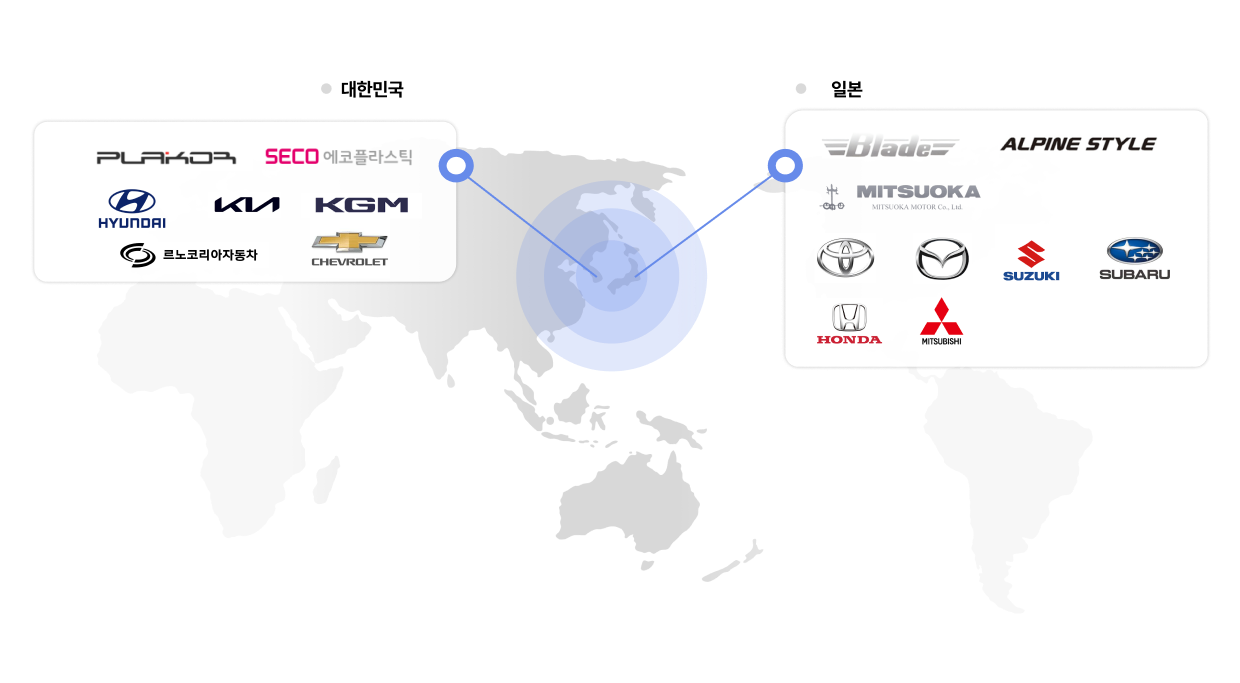 대한민민국을 중심으로 주요 생산 거점을 연결합니다.
